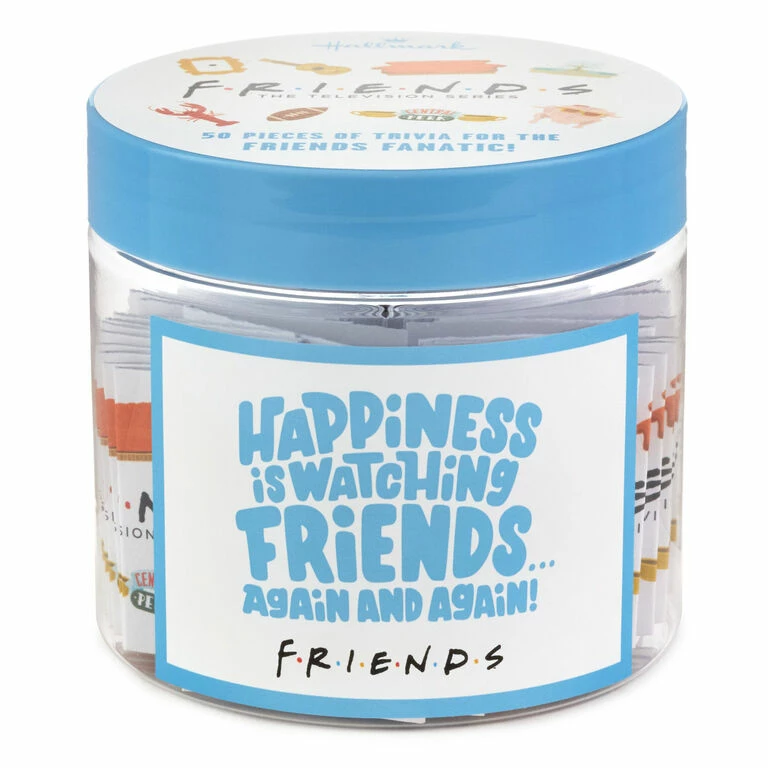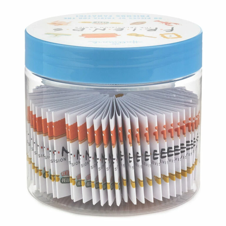 - “Friends” trivia jar includes 50 cards with trivia questions about the popular television series.